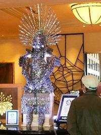 豊臣秀吉が着用していたかぶとをモチーフにしたステンドグラス製の甲冑が、名古屋マリオットアソシアホテル(名古屋市中村区)のロビーで31日まで限定公開されている。光り輝く姿は高さ約2メートル、重さ約80キロ。「ステンドグラス製で最も大きい甲冑」として昨年4月、ギネス世界記録に認定された。