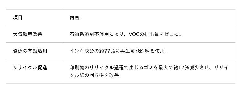 「eLinks(R)」は、太陽光と反応して光化学スモッグの原因となるVOC排出の一因となる石油由来の溶剤やプラスチック原料を一切使わず、環境への負荷を極限まで低減した画期的なインキです。