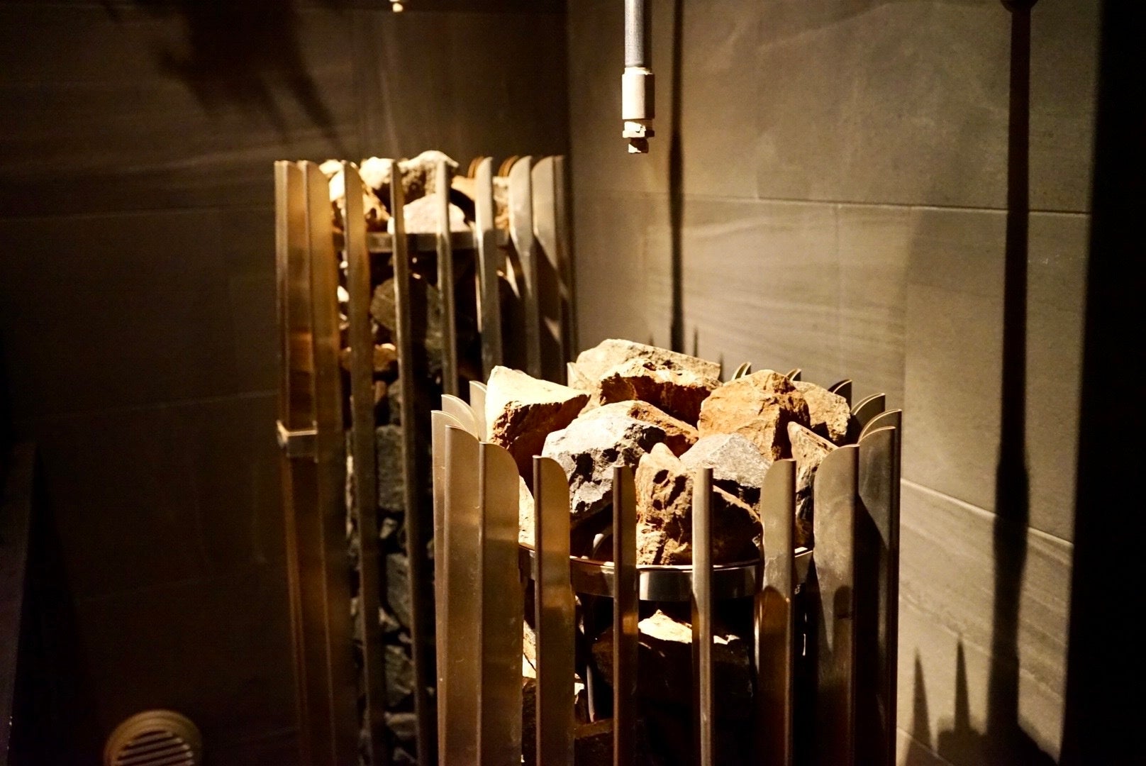フィンランドのサウナメーカー「Helo(ヘロ)」のストーブを2台設置したサウナ室です。一定の時間になると、自動で水がストーブにかかり、室内に蒸気が広がる仕組みを導入しています。