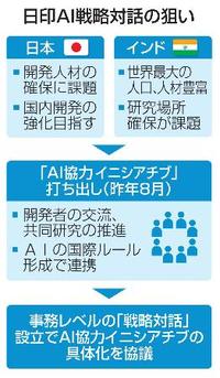 日本、インド両政府は、人工知能(AI)分野で連携強化を図る事務レベルの「戦略対話」を設立する方針を固めた。昨年8月の首脳会談で打ち出した「AI協力イニシアチブ」に盛り込んだ開発者の交流や共同研究の具体化に向けて、年内の初開催を目指す。茂木敏充外相が今月16日に、インドでジャイシャンカル外相と会談して合意する方向で調整している。複数の外交筋が10日、明らかにした。