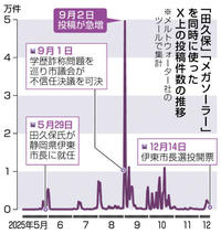 伊東市長選前市長が大差で敗北 SNS人気 票つながらず 明確な対立構造なく効果限定的 2026年1月11日 05:00 静岡県伊東市長選の最終日、田久保真紀氏の街頭演説に集まった支援者ら=2025年12月13日、伊東市 選挙における交流サイト(SNS)... 残り1386文字(全文:1403文字) この記事をお読みいただくには「デジタルプラン」または「宅配+デジタルプラン」の会員登録が必要です。無料会員の方はログインしてマイページからコース変更してください。デジタルプランまたは宅配+デジタルプランをご登録中の方はログインしてください。 岐阜新聞デジタル会員に登録すると 無料会員向け記事が読める ニュースレターで最新情報が受け取れる デジタルプラン、宅配+デジタルプランなら Webオリジナルコンテンツが読める 紙面ビューアが読める チケットの先行発売に参加できる お得なクーポンが使える 新規登録ページ ログインページ トップ 岐阜のニュース 伊東市長選前市長が大差で敗北 SNS人気 票つながらず 明確な対立構造なく効果限定的 関連記事 自虐キャラ・タカオ君口癖「飛騨じゃねぇし」→高山市長「来てみてな!」 長野県高山村と交流 リニア水位低下、瑞浪市大湫町で代替水源供用へ JR東海が井戸整備、説明会 スノーボード 三木準々決勝敗退 W杯パラレル大回転 ★成田が左肩脱臼 スキー 複合男子 渡部暁、W杯最多296戦出場 バドミントン 福島・松本組 準決勝敗退 マレーシア・オープン おすすめ記事 岐阜県内、12日明け方にかけ警報級の大雪の恐れ【11日夜情報更新】 二十歳の誓い立てる 岐阜市など岐阜県内36市町で式典 刀剣乱舞コラボ企画展、入場者数1万人突破 関鍛冶伝承館 都道府県対抗女子駅伝、岐阜は35位 大阪が優勝