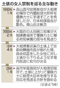 高市早苗首相は、25日に千秋楽を迎える大相撲初場所の表彰式で、自ら土俵に上がって優勝力士に内閣総理大臣杯を授与する対応を見送る方針を固めた。土俵に女性が上がれない「女人禁制」の伝統文化を尊重すべきだと判断した。女人禁制の慣行は女性差別に当たるとの指摘もあり、議論を呼ぶ可能性がある。政府関係者が12日、明らかにした。