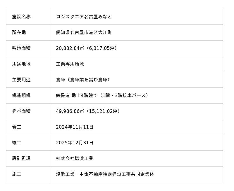 「ロジスクエア名古屋みなと」は、地上4階建て、延べ面積49,986.86平方メートル (15,121.02坪)の物流施設であり、3階へ大型車両が直接乗り入れ可能な車路スロープを設け、トラックバースを1階及び3階に備える最大4テナントへの分割賃貸が可能なマルチテナント型の施設です。すべてのトラックバースは駐車場として利用することも可能で、入居テナントが車庫証明を取得することにより多様なオペレーションを実現します。