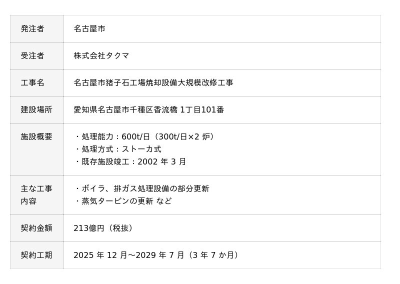 株式会社タクマ(本社:兵庫県尼崎市、社長:濱田州朗)は、このほど名古屋市から、同市のごみ処理施設「猪子石工場」の基幹的設備改良工事(以下「本工事」)を受注しましたのでお知らせいたします。