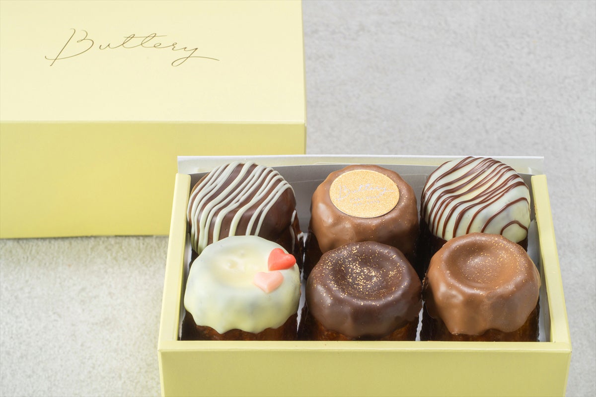 さらに、店頭販売限定のスイーツもたくさんご用意しています。Buttery本店・Buttery大名古屋ビルヂング店では、見た目も華やかなカヌレアソート『焼きたて6個SET(バレンタイン)』を販売します。フランス産発酵バターと北海道バターを贅沢に使い、自慢のスチームラックオーブンで焼き上げたカヌレ。ラム酒を効かせたプレーンカヌレとチョコレートリキュール入りのチョコカヌレを、金粉やチョコデコレーションで彩りました。