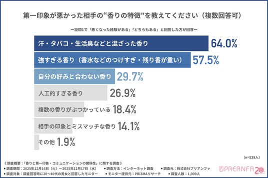 前問で『悪くなった経験のみある』『(良くなった経験も悪くなった経験も)どちらもある』と回答した方に、「第一印象が悪かった相手の“香りの特徴”」について尋ねたところ、『汗・タバコ・生活臭などと混ざった香り(64.0%)』が最多となり、『強すぎる香り(香水などのつけすぎ・残り香が重い)(57.5%)』『自分の好みと合わない香り(29.7%)』と続きました。