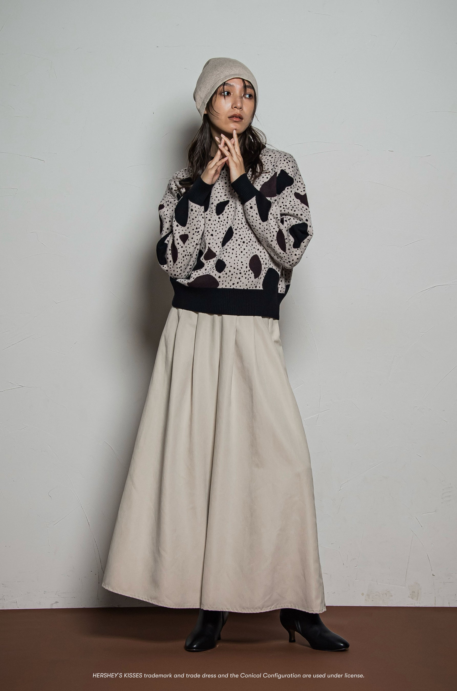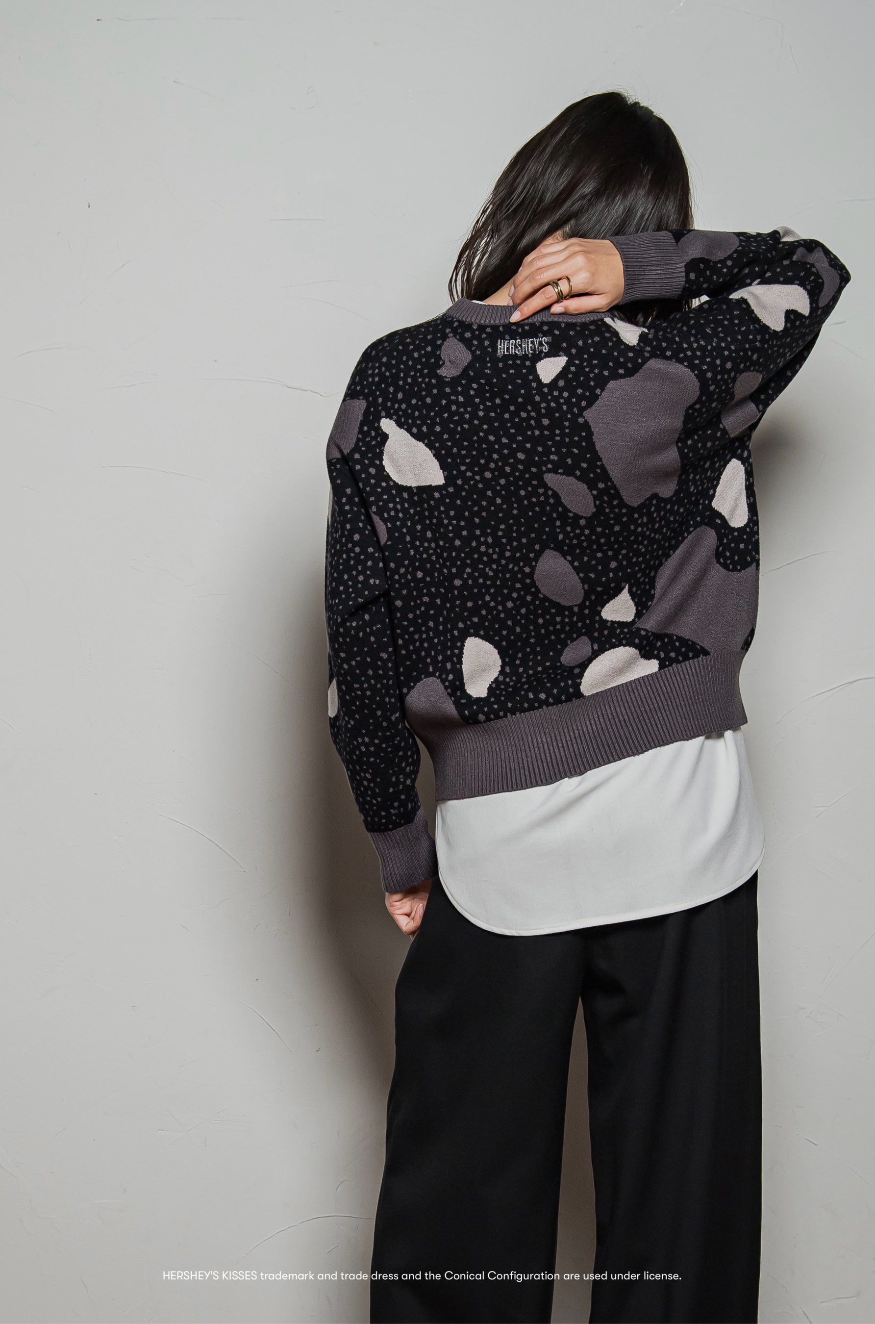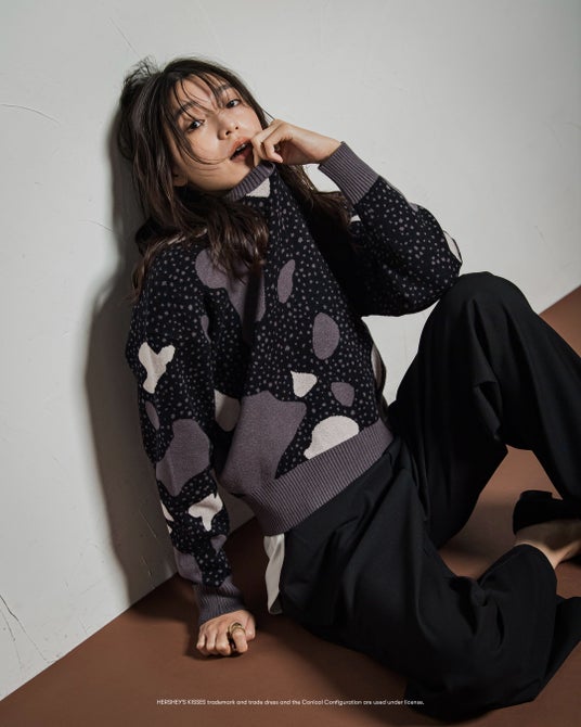 クッキー&クリームをイメージした、オリジナル柄のなかに、キスチョコモチーフとロゴ刺繍をしのばせた、遊び心濃いめの一枚。心地良いストレッチ性のある、もちもちニット糸を使用し、ハイゲージのジャガード編みで、スウェットライクに気楽に着ていただけます。ゆるっとしたフォルムとコンパクトな丈感でキュロットやワイドパンツ、スカートとの相性抜群。色使いをおさえて、シックにまとめるスタイリングがおすすめです。