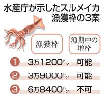 水産庁は14日、漁業関係者向けに開いた会議で、スルメイカの2026年漁期(4月〜27年3月)の漁獲枠について3万1200トン、3万9千トン、6万8400トンとする三つの案を示した。25年比で1・6〜3・6倍の増枠で、出席した漁業者からは枠が最大の案を要求する声が相次いだ。今後も会議を開き、2月中に結論を出す予定。
