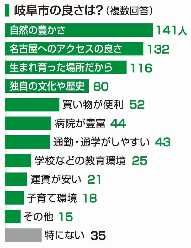 岐阜市長選(2月1日投開票)は25日の告示まで残り2週間を切った。物価高や人口減少、中心市街地の衰退など課題が山積する県都のリーダーを決める選挙戦では何が争点となるのか-。LINE(ライン)で読者とつながる岐阜新聞の「あなた発!トクダネ取材班」(あなトク)は市長選の論点を洗い出すべく、市政として伸ばしていくべき「岐阜市の良さ」について尋ねるアンケートを行った。回答で最多は「自然の豊かさ」で、「名古屋へのアクセスの良さ」が続き、現状ではベッドタウンとしての魅力が感じられるとの声が目立っていた。
