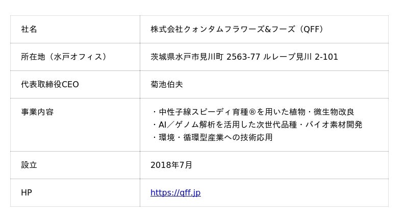 植物・微生物に中性子線を照射し、従来比で大幅な開発期間短縮を実現する高速育種技術「中性子線スピーディ育種(R)」を展開する株式会社クォンタムフラワーズ&フーズ(QFF/本社:茨城県水戸市、代表取締役 CEO:菊池 伯夫)は、2026年1月27日(火)~29日(木)に愛知県名古屋市で開催される「TechGALA Japan 2026」に出展いたします。TechGALA Japanは、国内外のスタートアップ、事業会社、研究機関、投資家が集結するグローバルテクノロジーイベントです。