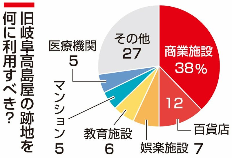 岐阜市の繁華街である柳ケ瀬商店街にあり、2024年に惜しまれつつ閉店した旧岐阜高島屋(同市日ノ出町)の跡地をどう利活用すべきか-。25日に告示される市長選(2月1日投開票)で論点の一つとなる県都の課題について、LINE(ライン)で読者とつながる岐阜新聞の「あなた発!トクダネ取材班」(あなトク)はアンケートを行った。選択式で尋ねたところ「商業施設」を選んだ人が最も多く、「百貨店」と答えた人を合わせると回答者全体の半数に。買い物を楽しめる施設の復活を望む声が大きいことが分かった。