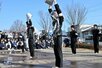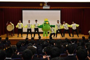 素足に学ラン姿の応援団員男女8人が登場し、それぞれ順番に「先輩方の健闘を祈って水をかぶらせていただきます」と声を張り上げ、勢いよくバケツの水を頭からかぶった。太鼓の音に合わせて演舞も披露し、受験生たちから大きな拍手が送られた。
