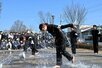 大学入学共通テスト(17、18日)の本番を控えた16日、岐阜市大縄場の岐阜高校で、応援団の1、2年生が、水をかぶって受験生を激励する恒例の「水ごり」を披露し、3年生約360人が後輩たちから気持ちのこもったエールを受けた。