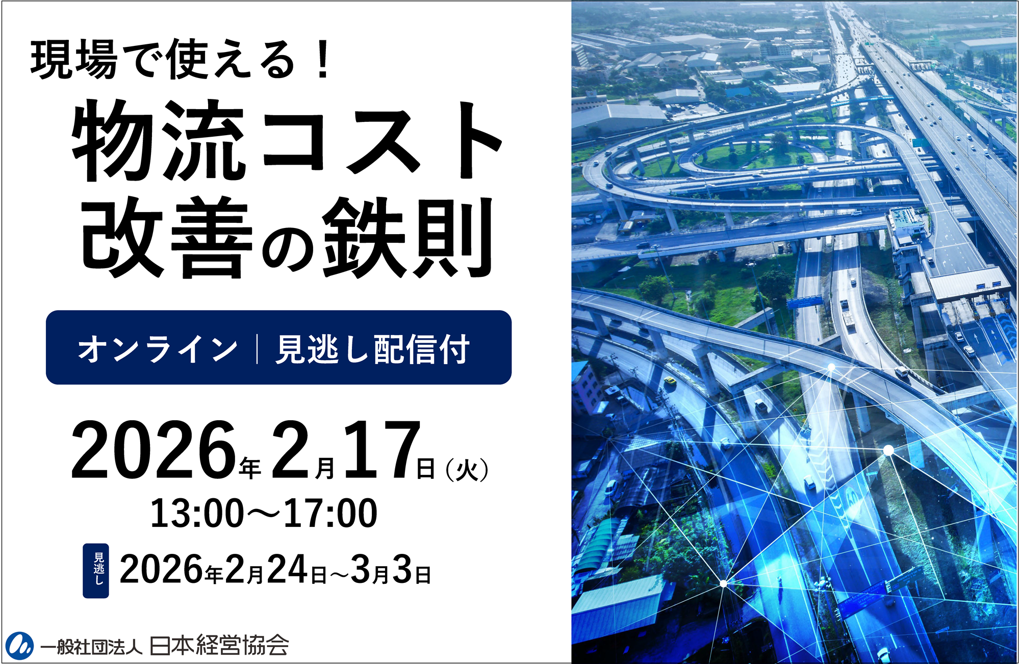 一般社団法人日本経営協会(所在地:東京都渋谷区、会長:高配 豪久)は、2026年2月17日(火)に、オンラインセミナー「現場で使える!物流コスト改善の鉄則~物流二法改正対応~」を開催いたします。
