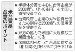 台湾、米に40兆円投資 相互関税合意 半導体分野が中心 2026年1月17日 05:00 【ワシントン、台北共同】トランプ... 残り591文字(全文:608文字) この記事をお読みいただくには「デジタルプラン」または「宅配+デジタルプラン」の会員登録が必要です。無料会員の方はログインしてマイページからコース変更してください。デジタルプランまたは宅配+デジタルプランをご登録中の方はログインしてください。 岐阜新聞デジタル会員に登録すると 無料会員向け記事が読める ニュースレターで最新情報が受け取れる デジタルプラン、宅配+デジタルプランなら Webオリジナルコンテンツが読める 紙面ビューアが読める チケットの先行発売に参加できる お得なクーポンが使える 新規登録ページ ログインページ トップ 岐阜のニュース 台湾、米に40兆円投資 相互関税合意 半導体分野が中心 関連記事 宮崎市中心部 不発弾を処理 陸自、1700人避難指示 豊田の住宅に遺体 燃えた跡、事件で捜査 デイ施設火災 元代表が死亡 高山、5年前に廃業 静岡・藤枝市で山林火災 余震続く朝、淡路島で誕生 31歳、命の奇跡胸に 「誕生日、祝っていいのかな」葛藤抱え 1.17語り継ぐ 阪神大震災31年 追悼行事、遺族ら決意 おすすめ記事 自動運転バス、岐阜市がレベル4対応の新車両公開 路上駐車をスムーズに回避【内部や外観グラフ】 高山市の旧デイサービス施設で火災、男性死亡 スゥープス、大垣で初の公式戦を白星で飾る バスケBリーグB3 明知鉄道のグルメ列車「枡酒列車」スタート 恵那市の山里眺めつつ地酒飲み比べ