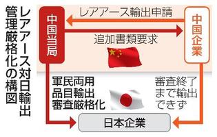【北京、上海共同】中国からレアアースを日本へ輸出する企業に対し、中国当局が打ち出した審査厳格化の詳細が17日判明した。販売先の企業や生産する製品を含むサプライチェーンに関する情報について、従来より詳しい報告書類を追加提出するよう求めた。今月6日の軍民両用品目の対日輸出管理強化を受けた措置。複数の通商筋が明らかにした。日本は先端技術に不可欠なレアアース輸入が遅れ、工業製品の生産に影響が及びそうだ。