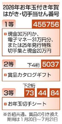 日本郵便は19日、2026年用のお年玉付き年賀はがきと切手の当せん番号を発表した。1〜3等の当せんはがきなどを郵便局の窓口に持ち込んで賞品と引き換える。引き換えは20日〜7月21日。