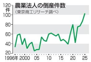 稲作や畜産を営む農業法人の倒産件数が2025年は103件に上り、記録が残る1989年以降で過去最多となった。東京商工リサーチが19日までに明らかにした。円安による資材価格の高騰や人件費の上昇が経営を圧迫した。小・零細企業が目立った。