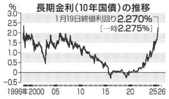 長期金利一時2・275% 消費減税論で財政懸念 2026年1月20日 05:00 国債市場で長期金利の指標である新発10年債の利回りを示すモニター=19日午後、東京都中央区 週明け19日の国債市場で、長期金... 残り530文字(全文:547文字) この記事をお読みいただくには「デジタルプラン」または「宅配+デジタルプラン」の会員登録が必要です。無料会員の方はログインしてマイページからコース変更してください。デジタルプランまたは宅配+デジタルプランをご登録中の方はログインしてください。 岐阜新聞デジタル会員に登録すると 無料会員向け記事が読める ニュースレターで最新情報が受け取れる デジタルプラン、宅配+デジタルプランなら Webオリジナルコンテンツが読める 紙面ビューアが読める チケットの先行発売に参加できる お得なクーポンが使える 新規登録ページ ログインページ トップ 岐阜のニュース 長期金利一時2・275% 消費減税論で財政懸念 関連記事 ’26ぎふ衆院選 急浮上解散 ポスターやら投票用紙やら… 印刷会社も超短期戦 背中に刺し傷 男性死亡 姫路のマンション、殺人で捜査 道案内頼み「お礼」で接近 連絡先は明かさず 阿蘇山遊覧ヘリ不明 火口に墜落? 台湾客ら3人搭乗 大寒に泳ぐ 郡上本染 鯉のぼり ヴァレンティノさん死去 93歳 高級ブランド創業者 おすすめ記事 衆院選の立候補説明会、岐阜県内20陣営が出席 連合岐阜、衆院選各選挙区での支援方針決める 堀島行真、村瀬心椛ら岐阜県勢4人がミラノ五輪へ 全日本スキー連盟が代表52人発表 鯉のぼり、真冬の清流を泳ぐ 伝統工芸・郡上本染の「寒ざらし」