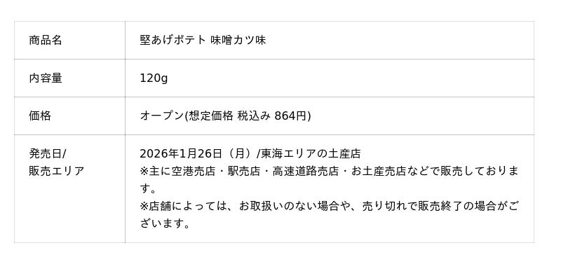カルビー株式会社(本社:東京都千代田区、代表取締役社長兼CEO 江原 信)は、“噛むほどうまい!”堅い食感が人気の「堅あげポテト」から、名古屋の食文化を象徴する“味噌カツ”の味わいを再現した『堅あげポテト 味噌カツ味』を2026年1月26日(月)から東海エリアの土産商品として新発売します。