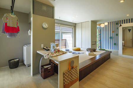 洗濯・乾燥機を、まるで収納家具のようにすっきり隠す設置方法があります。専用の室内干しスペースを設けるのが理想的ですが、それが難しい場合は、 キッチンに隣接した空間や、2階ホール、廊下の一角などに「洗濯コーナー」を設けるのも一案です。さらに、その空間にはちょっとしたテーブルや椅子、ベンチなど、くつろげる家具を配置することで、衣家事をより快適に行える環境が整いますよ。