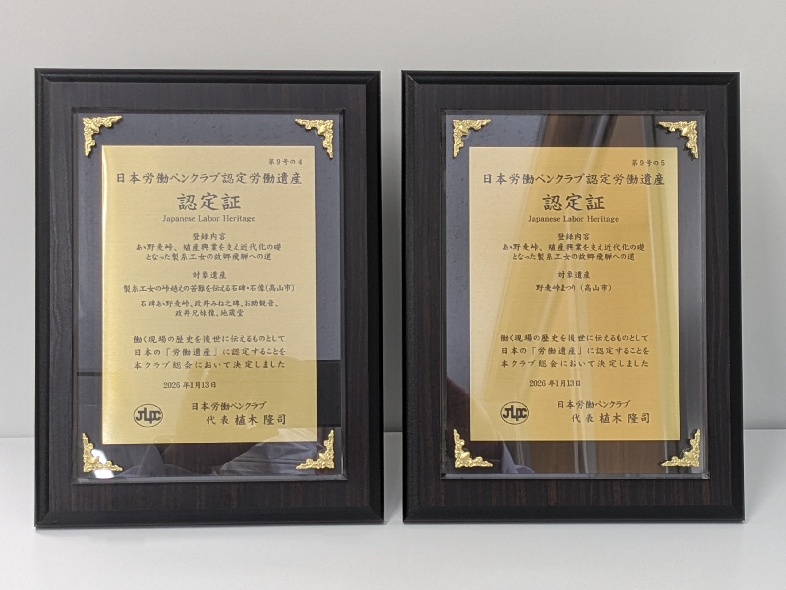 岐阜県高山市と長野県松本市の「あゝ野麦峠、殖産興業を支え近代化の礎となった製糸工女の故郷飛騨への道」が日本労働ペンクラブが認定する「労働遺産」に認定され1月13日、認定証交付式が行われました。