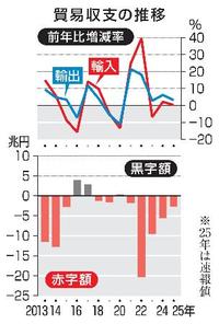 財務省が22日発表した2025年の貿易統計(速報、通関ベース)によると、輸出から輸入を差し引いた貿易収支は2兆6507億円の赤字となった。赤字は5年連続で、赤字幅は前年比52・9%減。米国向け輸出額は4・1%減の20兆4140億円となり、5年ぶりに減少した。自動車が11・4%減った。トランプ米政権による高関税措置が影響した。