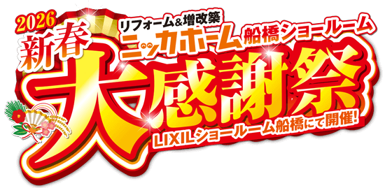 全国100店舗以上展開!2026年に創業39周年を迎える、リフォーム&増改築 ニッカホーム株式会社 (本社:愛知県名古屋市緑区篭山、代表取締役社長:西田裕久、以下 ニッカホーム)の ニッカホーム船橋ショールーム が主催の「新春大感謝祭」を、LIXILショールーム船橋 にて開催します!1月24日(土)、1日限定のイベントですので、この機会をお見逃しなく!
