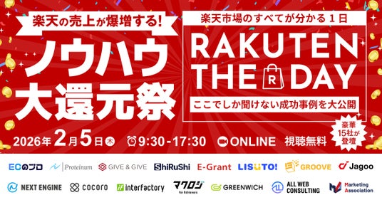 ECサイトの運営代行サービスを提供しているマーケティングアソシエーション株式会社(本社:東京都台東区 代表取締役:中園広和、以下当社)は、2026年2月5日(木)に、株式会社WUUZY様主催のオンラインカンファレンス【楽天市場のすべてが分かる1日 RAKUTEN THE DAY 2026 ~日本中が楽天に染まる日-ここでしか聞けない成功事例を大公開~】にて登壇いたします。