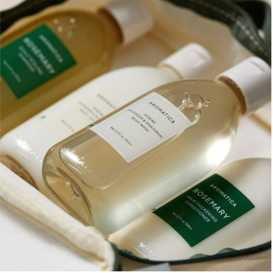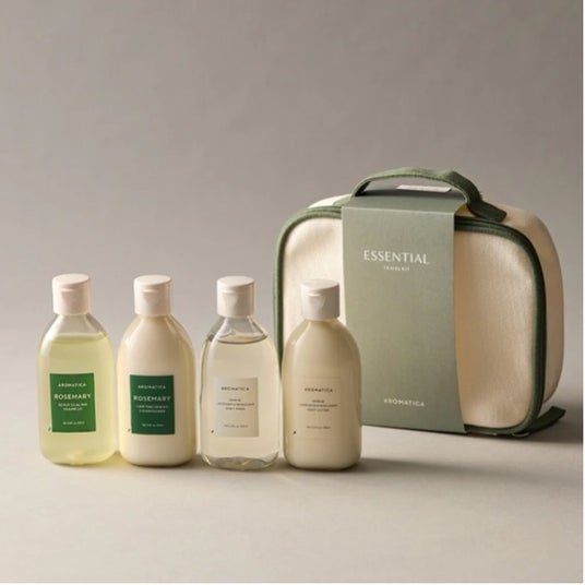 AROMATICAのベストセラーを詰め込んだ特別なトラベル&トライアルキット。 ローズマリー(※1)の清涼感が頭皮を健やかに導く シャンプー&コンディショナーと ラベンダー&マジョラムの香りで深い安らぎを与える ボディウォッシュ、ボディローションの4点セットです。 コンパクトながらたっぷり試せるサイズ(各100ml)で トライアルや、年齢性別を問わないギフトにおすすめです。