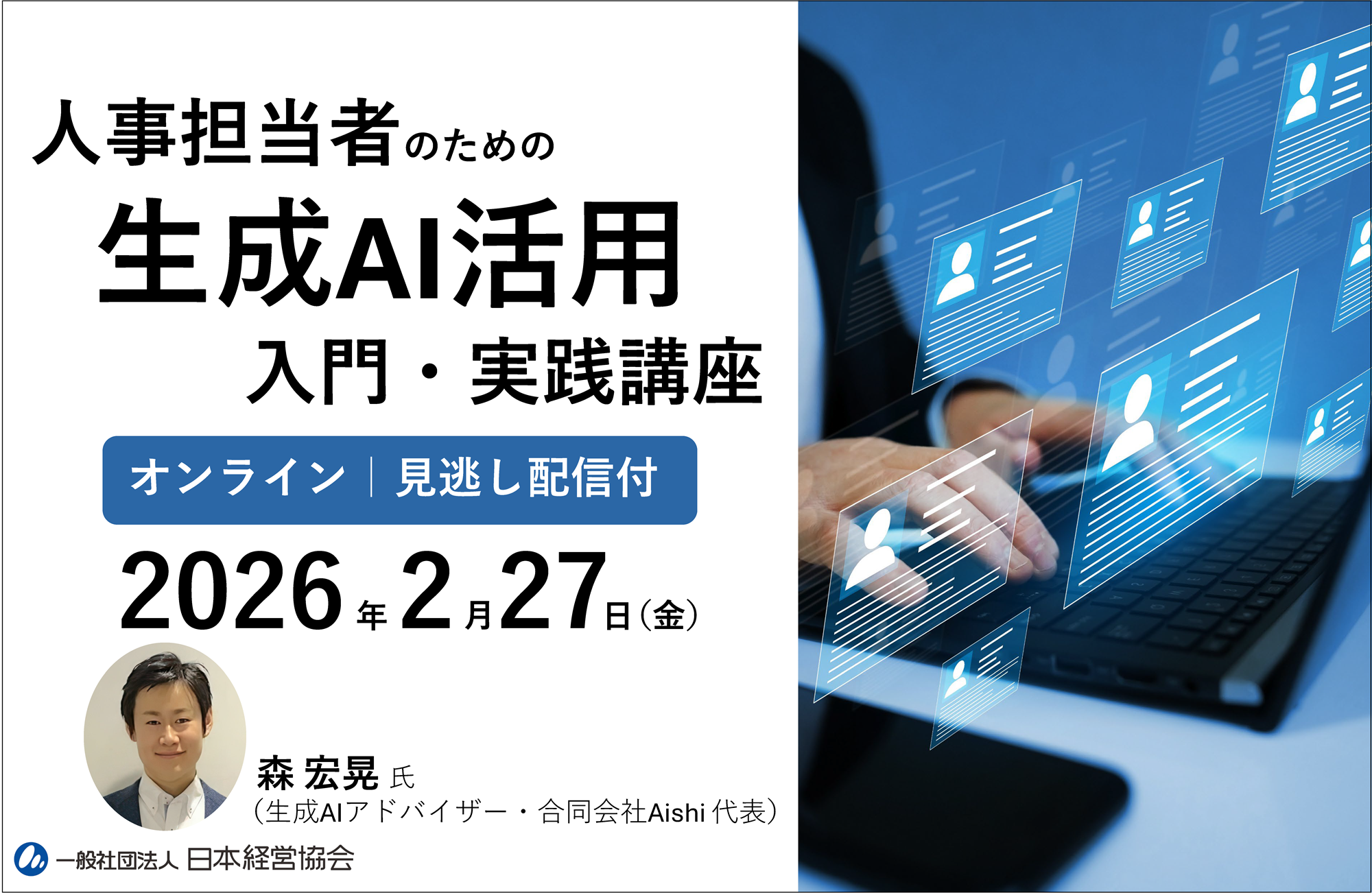 一般社団法人日本経営協会(所在地:東京都渋谷区、会長:高原 豪久)は、2026年2月27日(金)にオンラインセミナー「人事担当者のための生成AI活用入門・実践講座」を開催いたします。