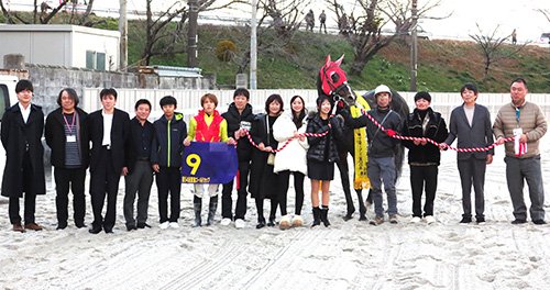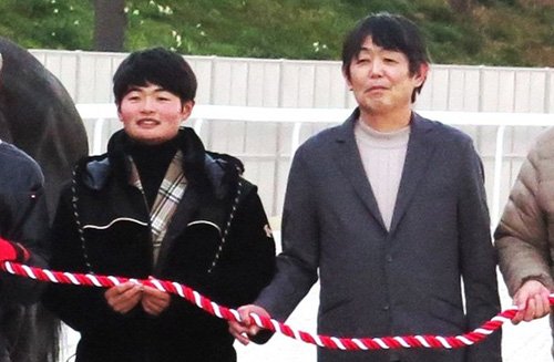 この日、トークショーを行った田口貫太騎手がヒストリーメイカーの口取り写真撮影にも参加。輝彦調教師と親子一緒に手綱を持ち、喜びを分かち合った。