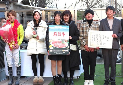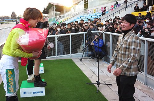 貫太騎手は表彰式でもプレゼンターを務め、塚本騎手に花束を贈呈。にこやかな2人をファンも「おめでとう」と祝福し笑顔の輪が広がった。貫太騎手がトークショーで注目していた元自厩舎のニホンピロタイズも3着に粘り込み、見せ場をつくった。