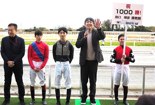 初出走から23年8ヵ月での通算1000勝達成。田口調教師は「素直にうれしいです。ずっとうちの厩舎を支えてくださったオーナーはじめ、厩務員さんら全ての人に感謝したいです。振り返ってみれば早かった。1000勝ということは、連勝した馬もいたから何百頭もの馬が勝ってくれたから。そこがうれしいので、苦労したというよりも感謝したいですね、馬たちに」と喜びを語った。