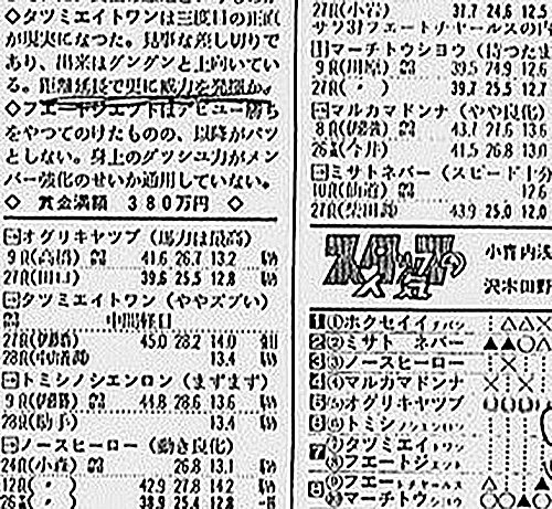 アンカツさんがレースで騎乗した秋風ジュニアやジュニアクラウンでは、田口調教師がキャップの攻め馬を担当していたことが、調教タイム欄にも記載されていた。秋風ジュニア追い切りでは馬なりでラスト3Fを39秒6と好仕上がり。「馬力は最高」とある。レースはアンカツさんが初騎乗し、マーチトウショウに4馬身差完勝。キャップが2回負けたマーチには川原正一騎手が追い切りにも騎乗していた。