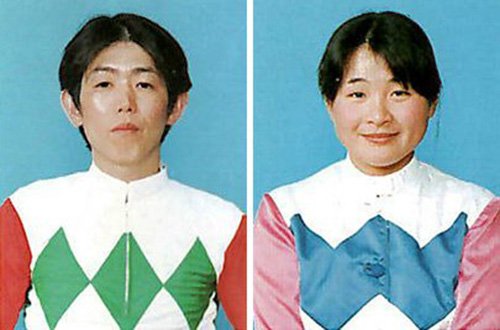 ジョッキー時代の田口輝彦さんと中島広美さん(笠松競馬提供)