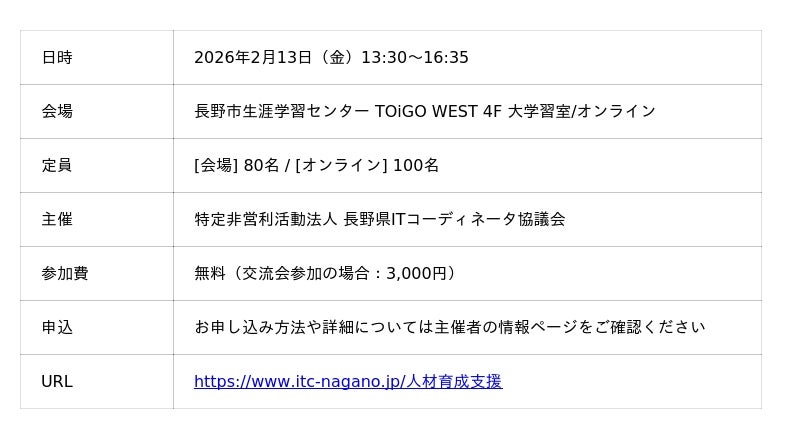 株式会社テクノア(本社:岐阜県岐阜市、代表取締役:山崎 耕治)は、2026年2月13日(金)に開催される「デジタル経営カンファレンス in NAGANO」(主催:長野県ITコーディネータ協議会)に登壇することをお知らせします。