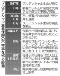 31億円不正、被害拡大も 調査継続、社長が謝罪 プルデンシャル 2026年1月24日 05:00 外資系生命保険プルデンシャル生命... 残り748文字(全文:765文字) この記事をお読みいただくには「デジタルプラン」または「宅配+デジタルプラン」の会員登録が必要です。無料会員の方はログインしてマイページからコース変更してください。デジタルプランまたは宅配+デジタルプランをご登録中の方はログインしてください。 岐阜新聞デジタル会員に登録すると 無料会員向け記事が読める ニュースレターで最新情報が受け取れる デジタルプラン、宅配+デジタルプランなら Webオリジナルコンテンツが読める 紙面ビューアが読める チケットの先行発売に参加できる お得なクーポンが使える 新規登録ページ ログインページ トップ 岐阜のニュース 31億円不正、被害拡大も 調査継続、社長が謝罪 プルデンシャル 関連記事 東大院教授 収賄疑い 警視庁逮捕 180万円分接待か 話の港 山梨・扇山の山林火災鎮圧 県内大雪、交通に影響 きょうも広範囲で降雪か 東海北陸道で4台絡む事故 白川村、けが人なし 男性刺殺疑い、男逮捕 姫路のマンション 石川で確保 おすすめ記事 名神高速や国道21号、25日未明から予防的通行止め 大雪の影響〈25日未明更新〉 岐阜県内大雪、25日昼前にかけ警戒〈24日夕更新〉 東海北陸道と国道156号の通行止め解除【情報更新】 竹かご、かさ、みの・・・飛騨の名品並ぶ 高山市で二十四日市
