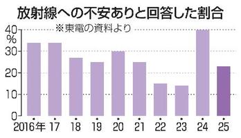 東京電力が福島第1原発で廃炉に携わる作業員約6千人に労働環境についてアンケートした結果、放射線への不安を抱える作業員は23%だった。過去最も高かった昨年の40%から17ポイント改善した。東電は、作業時のリスクを洗い出して対策を講じたほか、専門家による講習会で健康影響への理解が進んだとみている。