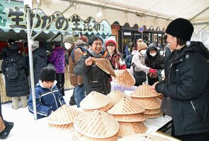 竹かご、かさ、みの・・・飛騨の名品並ぶ 高山市で二十四日市 ライフスタイル 2026年1月24日 18:15 7年ぶりに出店した「江名子ばんどり」=高山市本町 宮笠の品定めをする買い物客=高山市本町 ぜんざいを買ってくれた人に自分たちで育てたコシヒカリをプレゼントする児童=高山市本町 飛騨地域の民芸品や日用品などが並ぶ恒例の「二十四日市」が24日、高山市中心部の本町通りと安川通りで開かれ、市内外から地域の名品を買い求める客でにぎわった。 二十四日市は、かつて農家が農閑期に作った竹かごやかさ、みのなどを... 全文:477文字 この記事をお読みいただくには「デジタルプラン」または「宅配+デジタルプラン」の会員登録が必要です。無料会員の方はログインしてマイページからコース変更してください。デジタルプランまたは宅配+デジタルプランをご登録中の方はログインしてください。 岐阜新聞デジタル会員に登録すると 無料会員向け記事が読める ニュースレターで最新情報が受け取れる デジタルプラン、宅配+デジタルプランなら Webオリジナルコンテンツが読める 紙面ビューアが読める チケットの先行発売に参加できる お得なクーポンが使える 新規登録ページ ログインページ トップ 岐阜のニュース ライフスタイル 竹かご、かさ、みの・・・飛騨の名品並ぶ 高山市で二十四日市 関連記事 高山市で作業場や倉庫火災、男性けが 19カ国応募“平和なまち”こども絵画 泡原口さん(新宮小)入選 虹色の町で暮らす人々描く 「野麦峠工女」近代化の礎 労働遺産で認定証、後世に伝承 まつり実行委・小坂会長 「思いはせ訪ねて」 戦後80年、お年寄りメッセージ 「金言集」第6弾を発刊 高山市の山王まち協 平和の尊さ伝える ★SNS詐欺380万円被害 巨大氷柱「氷の渓谷」青白い神秘 飛騨大鍾乳洞 おすすめ記事 岐阜県内大雪、あす25日昼前にかけ警戒〈24日夕更新〉 名神高速や国道21号、25日未明から予防的通行止めの可能性 大雪の影響〈24日夜更新〉 大雪の影響、東海北陸道と国道156号通行止め 竹かご、かさ、みの・・・飛騨の名品並ぶ 高山市で二十四日市