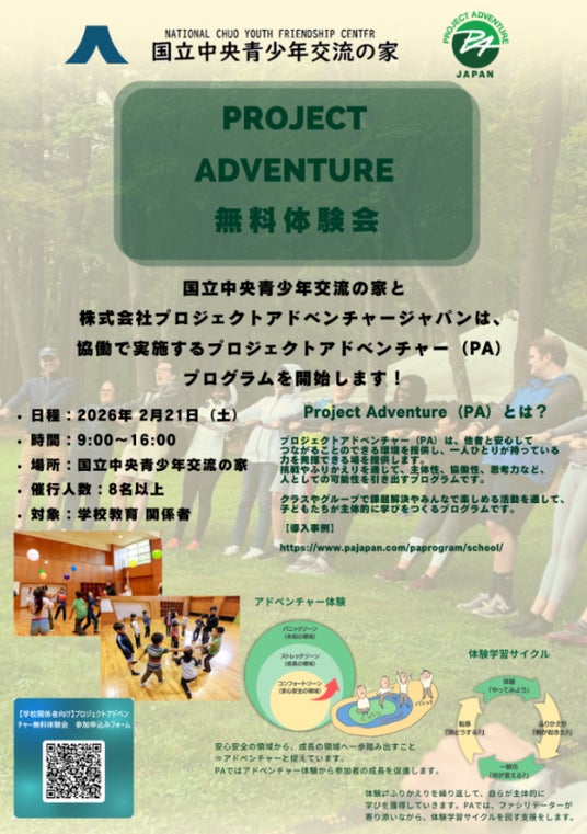 独立行政法人国立青少年教育振興機構 国立中央青少年交流の家(所在地:静岡県御殿場市、所長:藤原 一成)と、株式会社プロジェクトアドベンチャージャパン(本社:東京都千代田区、代表取締役:小澤新也)は、次世代に向けた学びの場を共に拓くべく提携し、体験型教育プログラムの提供を開始いたします。