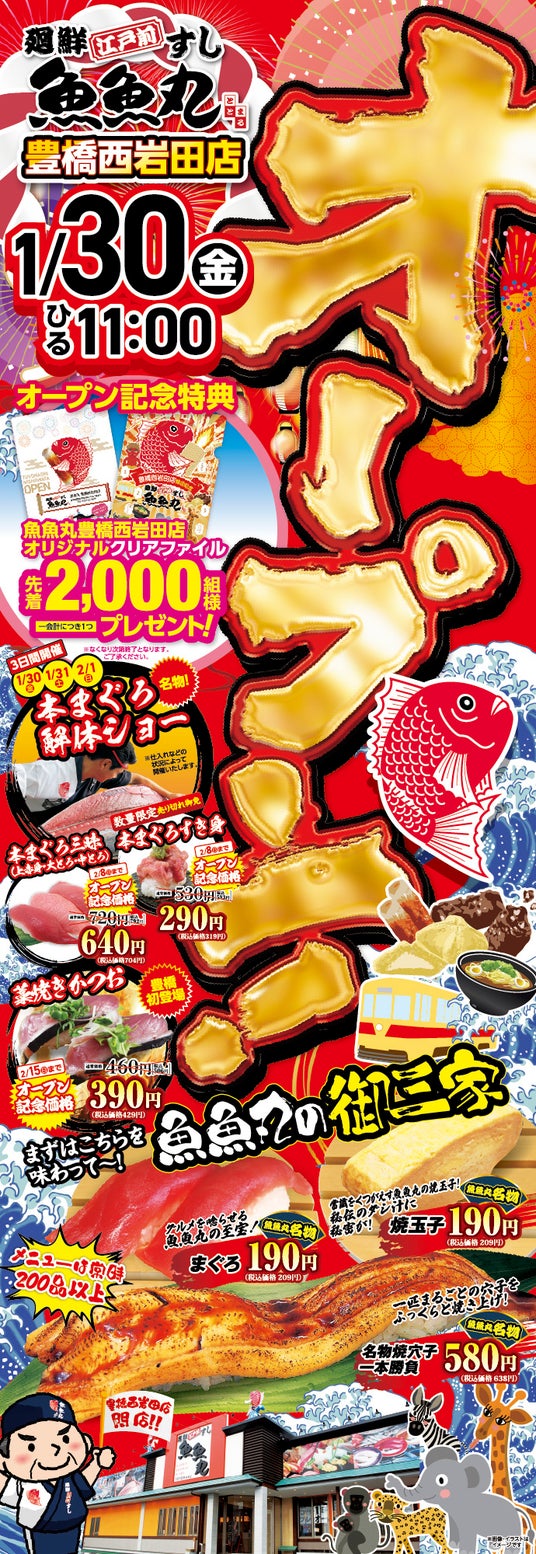 株式会社コムライン(本社:愛知県名古屋市緑区、代表取締役:新美文二)が運営する、三河湾・伊勢湾直送の鮮魚や全国から厳選した新鮮なネタが味わえるグルメ回転寿司「魚魚丸(ととまる)」は、2026年1月30日(金)、豊橋市内に「魚魚丸 豊橋西岩田店」をオープンいたします。本店舗は魚魚丸として(金の魚魚丸含む)累計30店舗達成の節目となる店舗であり、豊橋市内の店舗としては初めて「藁焼きブース」を常設した、臨場感あふれる体験型店舗となります。