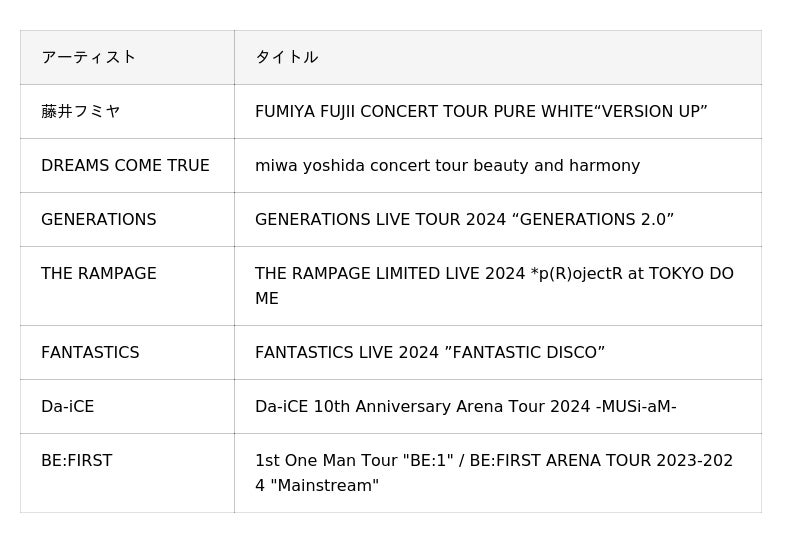 Leminoでは、視聴者のみなさまに、より豊かなエンターテインメント体験をお届けするため、2026年2月から音楽ライブ映像の配信を大幅に拡大いたします。世代を超えて愛され続ける藤井フミヤ、DREAMS COME TRUE、MISIAといった日本を代表するアーティストの軌跡を辿る作品群から、GENERATIONS、THE RAMPAGE、FANTASTICS、Da-iCE、BE:FIRSTといった今をときめくグループの圧巻のパフォーマンスまで、バラエティ豊かなラインアップをご用意いたしました。■注目の音楽ライブ配信ラインアップ