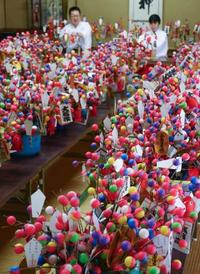 ピンクや黄色など色とりどりの「もち花」と呼ばれる小さな球や小判の飾りが付いた吉兆で、作業を進める室内は色鮮やかに染まった。大社によると、柳の枝は生命力があり福の神が宿ると伝えられる。節分の日に家に飾ると幸福が訪れると信仰されてきた。