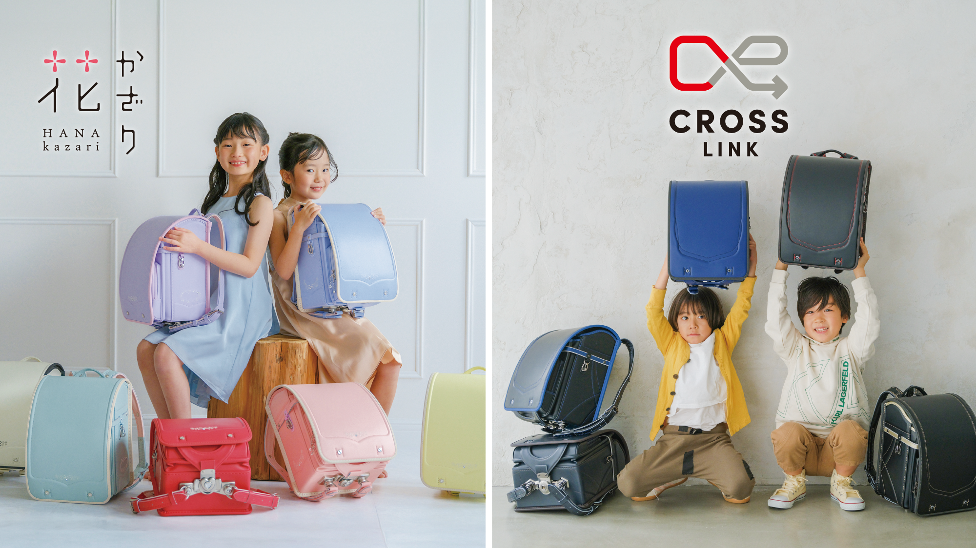 新作ランドセル 左/女児向け「花かざり」 左/男児向け「クロスリンク」