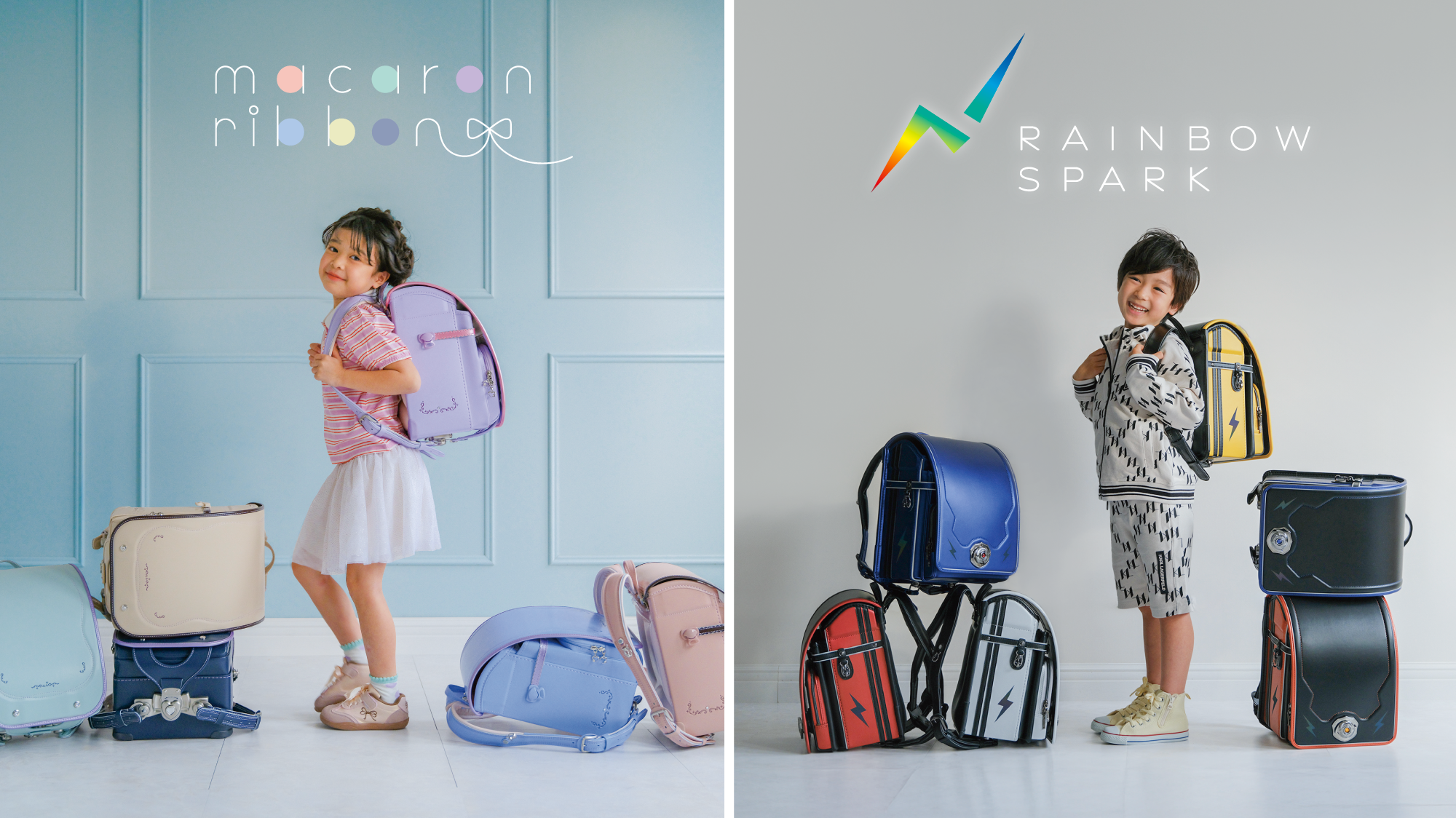 新作ランドセル 左/女児向け「マカロンリボン」 左/男児向け「レインボースパーク」