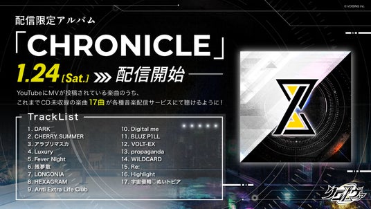 配信限定アルバム「CHRONICLE」は、2026年1月24日(土)0時より、各ストリーミングおよびダウンロードサービスでの配信を開始いたしました。あわせて、これまでCD未収録でYouTubeのみで公開されていた楽曲17曲をまとめたコンピレーションアルバムも配信開始。クロノヴァの軌跡を、より自由な形で楽しむことができます。