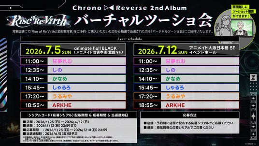 株式会社VOISING(本社:東京都港区、代表者:ないこ)所属の2.5次元アイドルグループ「クロノヴァ」は、グループ初となるツアー『Chrono▷◀Reverse 1st Live Tour「Rise of Re:Virth」』 の開催と、同名の2nd Album 「Rise of Re:Virth」 のリリースを発表しました。今回のライブとアルバムは、結成から2年間にわたる活動の集大成であり、クロノヴァが第1章に一区切りをつけ、新たな段階へ進むことを示すものとなります。自身初となる地方公演を含むツアーでは、「第一楽章に、終止符を」というキャッチコピーのもと、これまで積み重ねてきた歩みをステージ上でお届けします。この春、次のステージへと踏み出すクロノヴァにご注目ください。