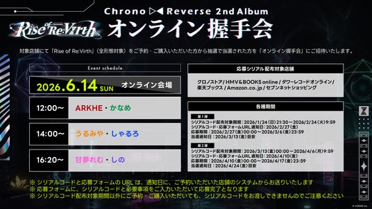アルバムの発売を記念し、特典イベントの開催も決定しました。アニメイト対象店舗でCDを予約した方の中から抽選で参加できるバーチャルツーショ会では、モニター越しにメンバーとのツーショット撮影が可能となります。本イベントは、2.5次元アイドル事務所「VOISING」として初の試みです。さらに、複数のオンラインストアを対象としたオンライン握手会も実施予定です。前回実施時より当選人数を拡大し、より多くの方がクロノヴァと交流できる機会をご用意いたしました。各店舗では数量限定の予約特典も展開され、詳細は後日発表されます。