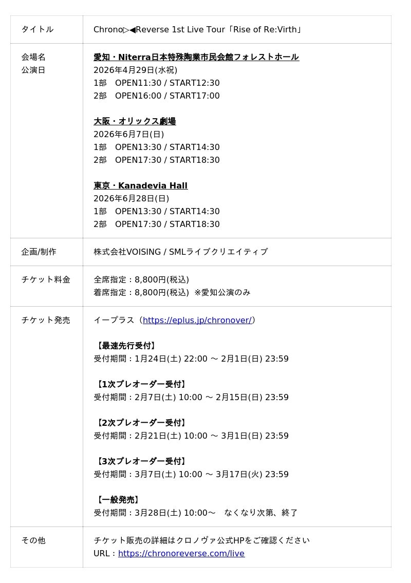 ■Chrono▷◀Reverse 1st Live Tour「Rise of Re:Virth」詳細
